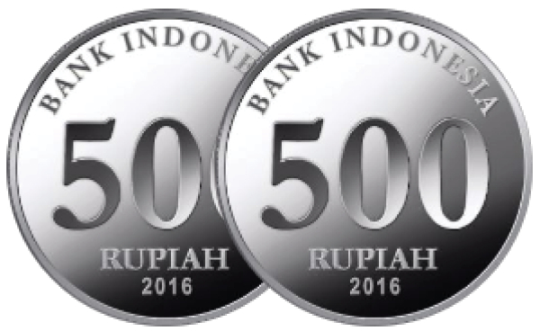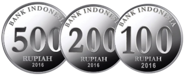 Terlihat 1 keping uang logam 500 rupiah, 1 keping uang logam 200 rupiah, dan 1 keping uang logam 100 rupiah.
