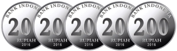 Terlihat 2 keping uang logam 200 rupiah dan 1 keping uang logam 500 rupiah.