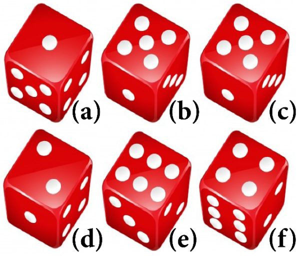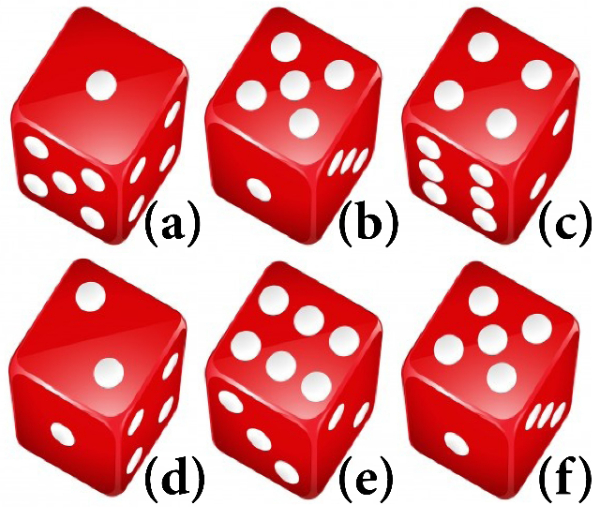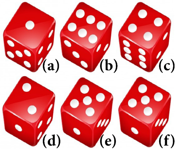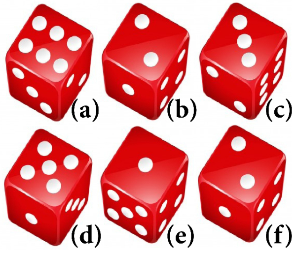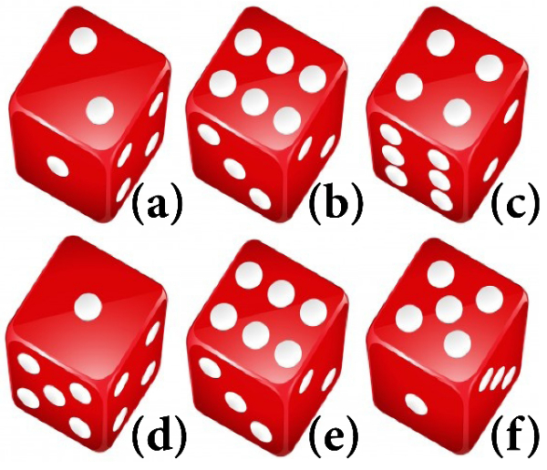 Gambar berikut merupakan gambar enam dadu yang ditandai dengan huruf (a) sampai (f).