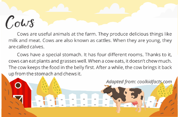 Kalimat yang menjelaskan makanan sapi adalah “Cows have a special stomach. It has four different rooms.” Kalimat kedua menjelaskan perut sapi yang memiliki keistimewaan. Keistimewaan itu adalah empat sekat/ruang penyimpanan makanan. Jawaban yang tepat adalah “It has some rooms.”