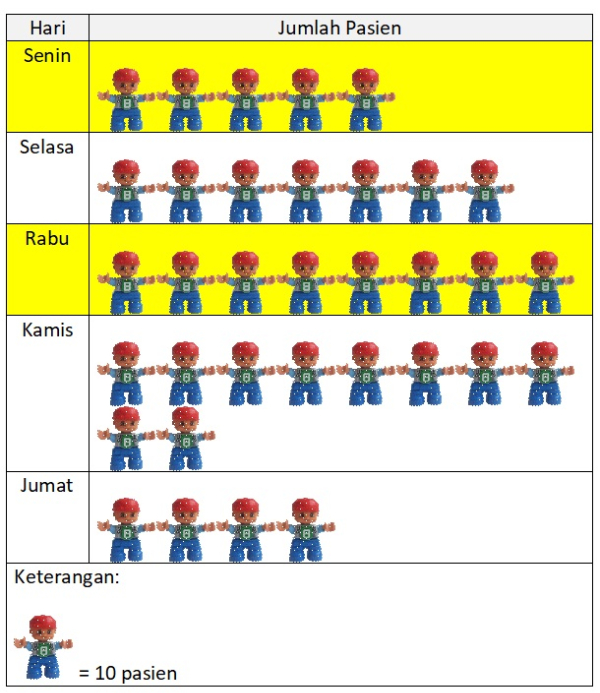 Pada piktogram, banyak pasien hari Senin dan Rabu ditunjukkan secara berturut-turut pada baris kedua dan keempat (warna kuning).