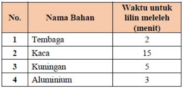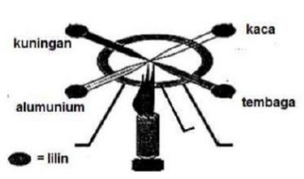 Masing-masing ujung logam diletakkan lilin, sedangkan ujung yang lainnya dipanaskan. Hasil pengamatan dari percobaan tersebut adalah sebagai berikut.