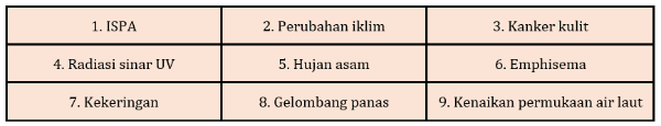 Berdasarkan tabel di atas, yang termasuk dampak pencemaran udara terhadap kesehatan manusia adalah ....