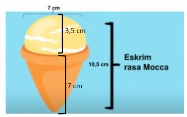 Perhatikan ukuran es krim dalam gambar berikut. Diameter bagian es krim dalam bentuk setengah bola adalah 7 cm, dengan demikian jari-jarinya adalah 3,5 cm dan tinggi kerucut adalah 7 cm.