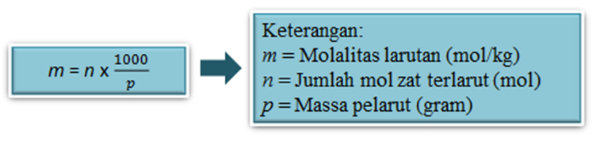 Molalitas atau kemolalan menyatakan banyaknya mol zat terlarut dalam setiap 1.000 gram pelarut. Jadi, molalitas dapat dinyatakan dengan rumus di bawah ini: