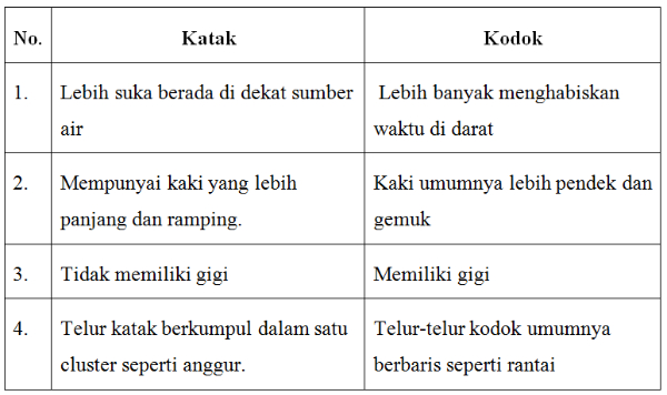 Perbedaan antara katak dan kodok yang tepat sesuai dengan nomor ....