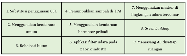 Berdasarkan tabel, upaya yang bisa dilakukan untuk mengurangi dampak efek rumah kaca adalah ....