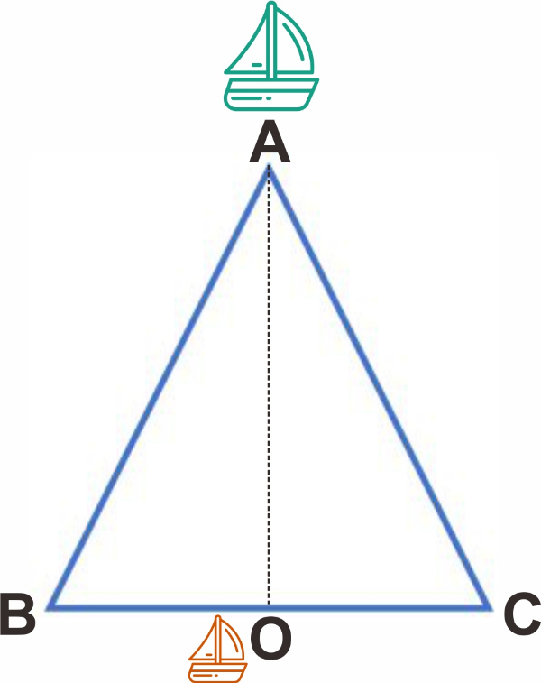 Kapal hijau terletak di titik A dan kapal oranye di titik O.